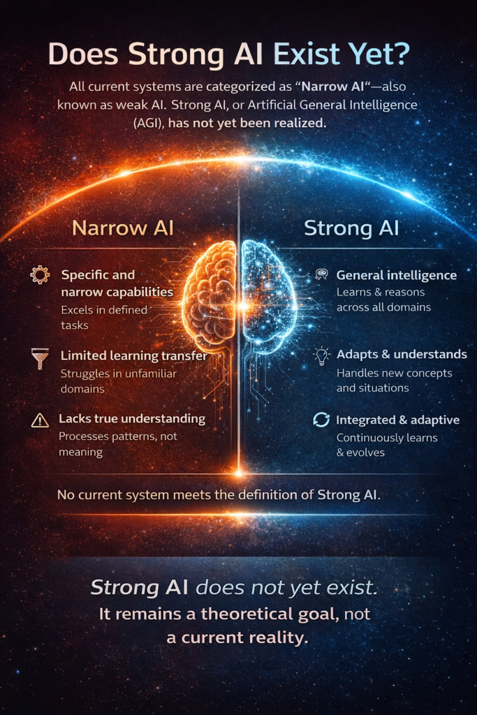 • Strong AI remains a theoretical goal, not a current reality